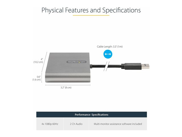 Leveraging the USB 3.0 interface, this quad monitor adapter dongle delivers high-definition resolutions up to 1920x1080 (1080p) on all four ports. The adapter also supports 2-channel audio through HDMI.