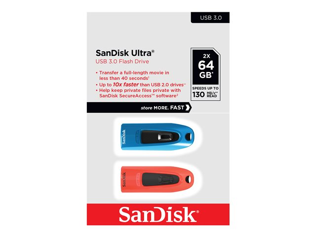 The SanDisk Ultra USB 3.0 Flash Drive combines faster data speeds and generous capacity in a compact, stylish package. Spend less time waiting and transfer files to the drive up to ten times faster than with a standard USB 2.0 drive. With a high storage capacity, the drive can accommodate your bulkiest media files and documents.