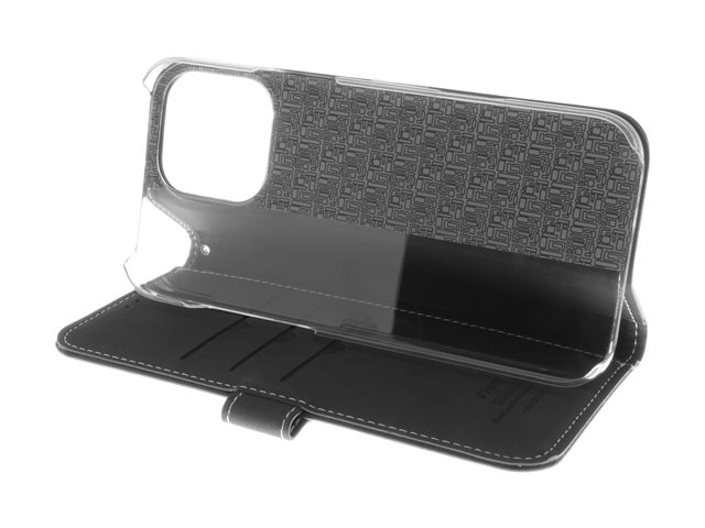 Insmat Exclusive - Lommebok for mobiltelefon - ekte skinn, kartong+papir+aluminiumsfolie, polykarbonat (PC), bomullssting - svart - for Apple iPhone 16 Pro Max