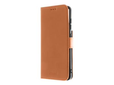 Insmat Premium - Lommebok for mobiltelefon - ekte skinn, termoplast-polyuretan (TPU), kartong+papir+aluminiumsfolie, bomullssting - brun - for Samsung Galaxy S21 FE 5G