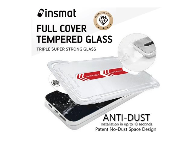 The Insmat screen protector provides protection for cellular phones, crafted from high-quality tempered glass with a 9H rating for impact resistance. This product features an easy installation process, complemented by a No-DUST installation frame and includes wet and dry cloths for a clean application. Designed to be full cover, it offers a dirt repellent coating that keeps the screen clear and enhances usability with its oleophobic surface that resists fingerprints and smudges. With triple reinforcement, this screen protector guards against everyday wear and tear and minimizes the risk of fractures from accidental drops. The sleek black frame seamlessly integrates with any device, ensuring that your phone maintains its appearance while benefiting from protection. This screen protector is an accessory for anyone looking to extend the life of their cellular device.