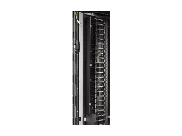 The vertical channels have smooth plastic fingers at 1U increments to allow patch cords to enter and exit in an organized manner.