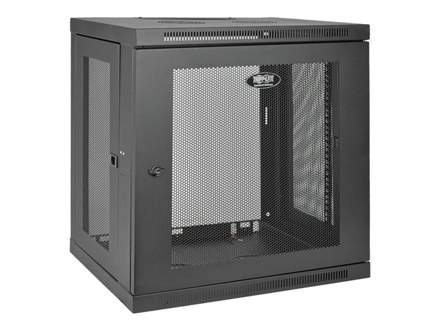 The SRW12U SmartRack 12U Low-Profile Switch-Depth Wall-Mount Rack Enclosure Cabinet is designed to house EIA-standard 19-inch rack equipment in network wiring closets, retail locations, classrooms, back offices and other areas with limited floor space where you need equipment to be secure, organized and out of the way. Constructed from heavy-duty steel with a durable black powder-coated finish, the cabinet has a maximum load capacity of 200 pounds. The side panels and front door lock securely to help prevent damage, tampering or theft. The front, top, bottom and removable side panels are vented, which allows air to flow freely and keep equipment cool. The reversible front door can open left or right by rotating the cabinet 180° before mounting. Convenient top and bottom ports allow easy cable routing. The SRW12U comes fully assembled and ready to mount to the wall, or use Tripp Lite’s optional SRCASTER rolling caster kit to make it a mobile rack. Square and threaded mounting holes and numbered rack spaces make equipment installation easy. The vertical mounting rails adjust in 7/8-inch increments to accommodate equipment up to 16.5 inches deep, such as network switches and patch panels.