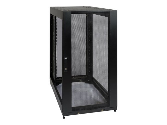 Tripp Lite's SR25UB premium SmartRack Enclosure Cabinet is packed with features designed to simplify rack equipment installations and rack equipment maintenance: top and bottom cable routing ports, perforated door and side panels to promote efficient airflow, adjustable vertical mounting rails and more. And as part of the SmartRack family, the SR25UB is compatible with Tripp Lite's extensive range of rackmount accessories, enabling you to customize your solution to meet any requirement. The SR25UB has 25U of capacity and is compatible with all standard 19-inch rack equipment. The front and rear pairs of vertical rails feature square mounting holes and are numbered by rack space for easy reference. The rails are adjustable in quarter-inch increments to accommodate equipment depths from 4 to 37 inches. Adjustment is quick and convenient: simply unscrew the rails, slide them to the desired depth and restore the screws. The rails feature square mounting holes and are capable of supporting up to 3000 lbs. (1360.8 kgs) of equipment with included installation hardware (2250 lbs. (1020.6 kgs) rolling capacity). With a locking, reversible front door and locking, removable side panels, SR25UB provides safe, secure installation for all equipment. This prevents unauthorized access to installed equipment while making it easy for authorized personnel to perform inspections, maintenance and equipment replacement. The enclosure meets all requirements toward PCI DSS compliance. The top and bottom panels of the SR25UB are furnished with vents designed to help remove warm air from the enclosure and draw in cool air by convection. They also support installation of standard user-supplied case fans. The top and bottom panels are also provided with ports for cable routing. To simplify deployment, the SR25UB comes with casters that enable it to be maneuvered into to desired location, and then secured in place by adjusting the unit's levelers.