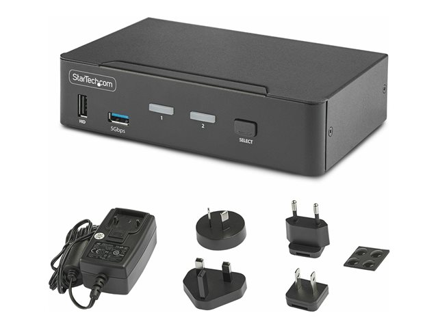 Share and switch between two USB-A and DisplayPort-enabled computers, using this DisplayPort KVM Switch. Share an 8K 60 Hz DisplayPort monitor, a keyboard and mouse, two USB 5 Gbps devices, and two additional USB 2.0 devices.