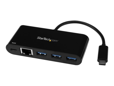 Turn a laptop USB-C port into three USB Type-A ports (5Gbps) and one GbE port, plus power and charge your laptop. This 3-port USB 3.0 hub with Gigabit Ethernet couples your USB peripheral and RJ45 network connections into a single convenient hub, with support for USB Power Delivery. This means that you can power and charge your laptop through its USB-C port while simultaneously powering the hub.