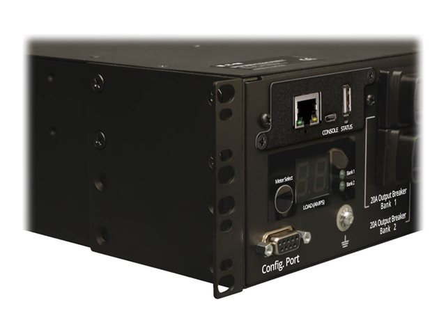 Tripp Lite Switched PDU / Power Distribution Unit offers advanced network control and monitoring with the ability to turn on, turn off, recycle or lock-out power to each individual receptacle, monitor site electrical conditions and remotely monitor output power consumption. Built-in LX Platform network management interface. The Java-free LX Platform HTML5-based network interface enables full remote access for PDU status monitoring and email notifications via secure web browser, SNMP, telnet or SSH. It supports 10/100 Mbps auto-sensing for optimum communication with an Ethernet network. Optional EnviroSense2 modules (sold separately) provide a variety of environmental monitoring capabilities. Protocols supported include HTTP, HTTPS, SMTP, SNMPv1, SNMPv2, SNMPv3, telnet, SSH, FTP, DHCP and NTP. Individually switched outlets can be controlled in real-time to remotely reboot unresponsive network hardware, or be custom programmed for user-defined power-up and power-down sequences to ensure proper startup of interdependent IT systems and prevent inrush-related overloads as network equipment is first energized. Unused PDU outlets can be electronically locked off to prevent the connection of unauthorized hardware. PDU output current consumption in amps is displayed locally via front panel current meter or remotely via web/network interface to warn of potential overloads before critical IT mains or branch breakers trip.