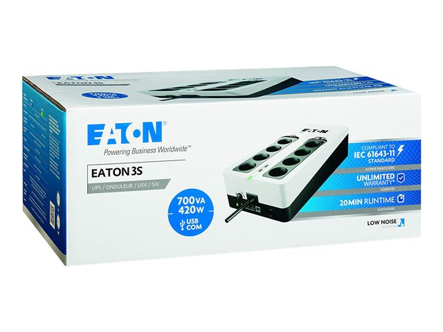 Eaton 3S provides power and surge protection for desktop computers, wireless networks, gaming consoles, and other critical electronics in your home or business. Attractive design and glossy finish make the 3S a perfect fit for the modern office environment. Compact unit fits on or under your desk or can be mounted on a wall. Easy-to-replace battery helps to extend UPS service life. HID-compliant USB port (cable supplied), for automatic integration with major operating systems (Windows/Mac OS/Linux).