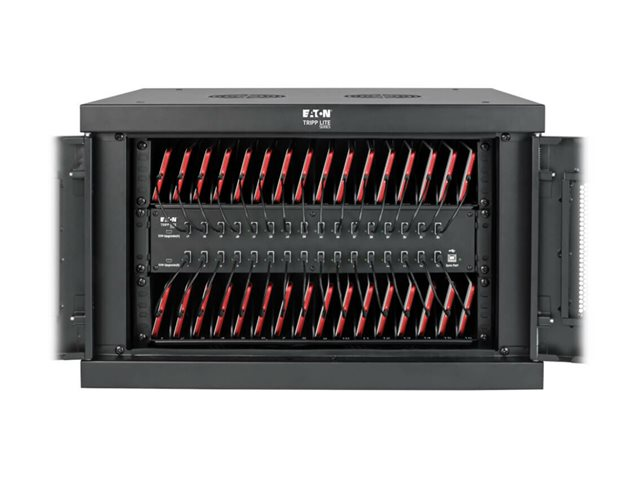 Eaton Tripp Lite Series 32-Device USB Charging Station Cabinet er en omfattende ladeløsning for smarttelefoner og andre USB-ladede enheter. Dette allsidige skapsystemet kan plasseres på et skrivebord eller monteres på en vegg, noe som gjør det ideelt for klasserom, kontorer og butikkmiljøer. Med 32 USB 2.0 A-ladeporter kan det lade flere enheter samtidig, slik at de alltid er klare til bruk. Skapet er bygget med en strømbryter for ekstra sikkerhet og har en robust stålkonstruksjon, noe som gjør det holdbart og sikkert. Den svarte pulverlakkerte overflaten bidrar ikke bare til holdbarheten, men gir også et elegant og profesjonelt utseende. Ladestasjonen er designet med tanke på brukervennlighet, og har et kabelhåndteringssystem, flyttbare skillevegger for enkel organisering og hurtigladefunksjoner. I tillegg har den avanserte sikkerhetsfunksjoner som overladings- og overstrømsbeskyttelse, samt EMI- og RFI-filtrering for å forhindre elektrisk interferens under lading. Med sine omfattende funksjoner og slitesterke design er Eaton Tripp Lite Series-ladestasjonen et viktig verktøy for å holde enhetene ladet, organisert og sikkert.