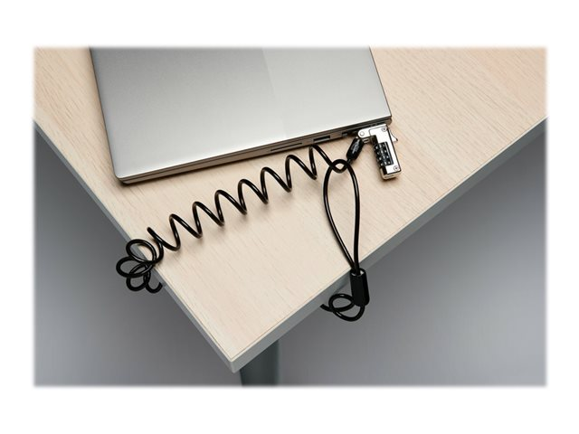 Ideal for thin laptops, the Slim Portable Combination Lock for Standard Slot allows the laptop to lie flat and stable without blocking valuable ports. Self-coiling carbon steel cable sheathed in plastic stretches up to 1.8m and shrinks down to 76mm for easy portability. Features include a resettable four-number combination, one-handed operation and Register & Retrieve for quick, secure and easy combination retrieval. Meets or exceeds rigorous strength testing standards.